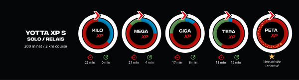 Le concept de la YOTTA XP, est de compléter un maximum de boucles en respectant le cut-off dégressif ! On t’explique, tu dois faire 4 min de moins par boucle mais le départ reste fixe. Tu dois donc être de plus en plus rapide, mais tu as de plus en plus de temps de pause entre chaque boucle. Pour tous les formats le départ se fera en mass start. Et pour le départ de la XP S, les femmes auront une arche qui leur sera “dédiée”. Le départ de la 5 ème boucle est en poursuite. Chaque athlète part en fonction de son classement. Le but étant de rattraper les premiers !